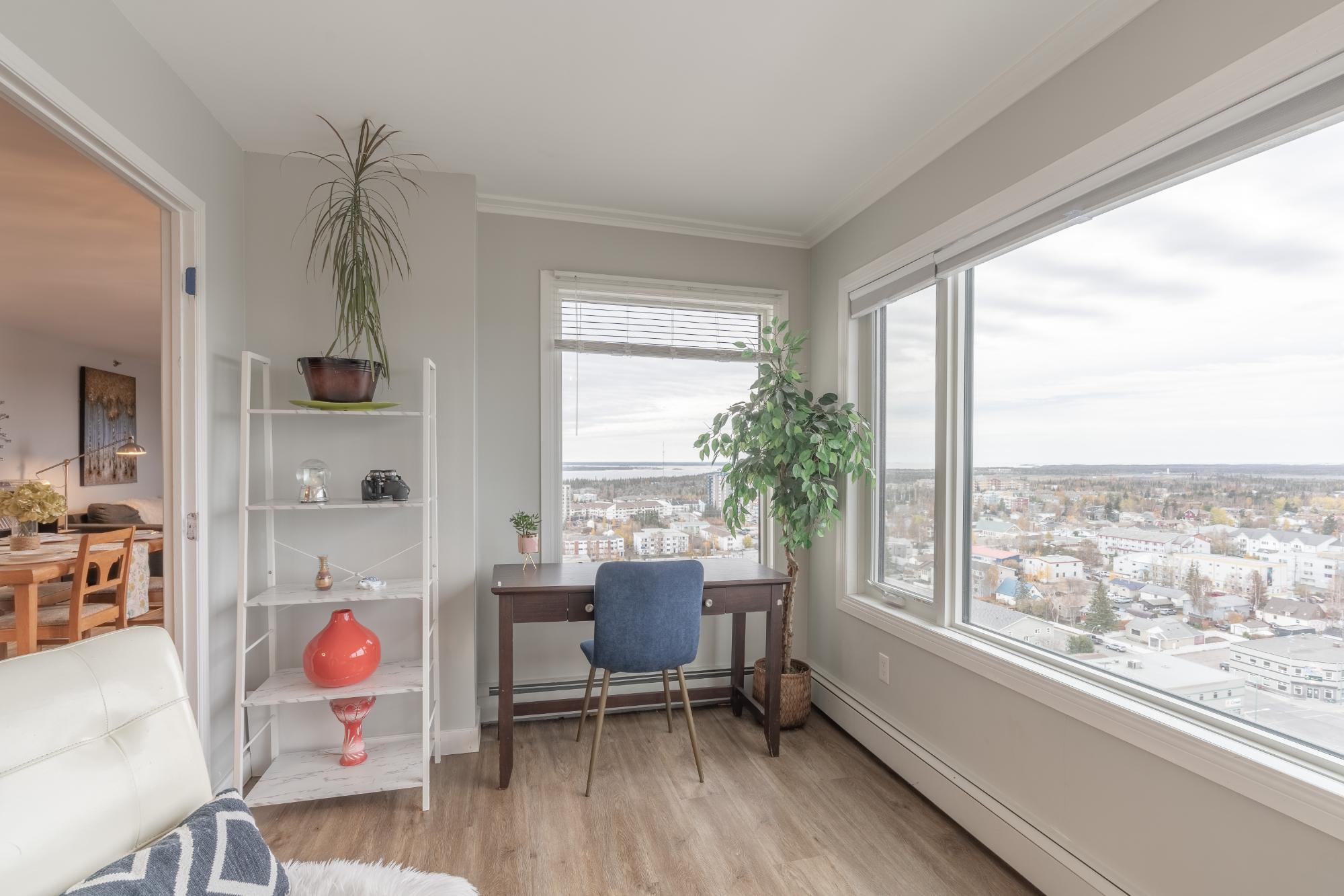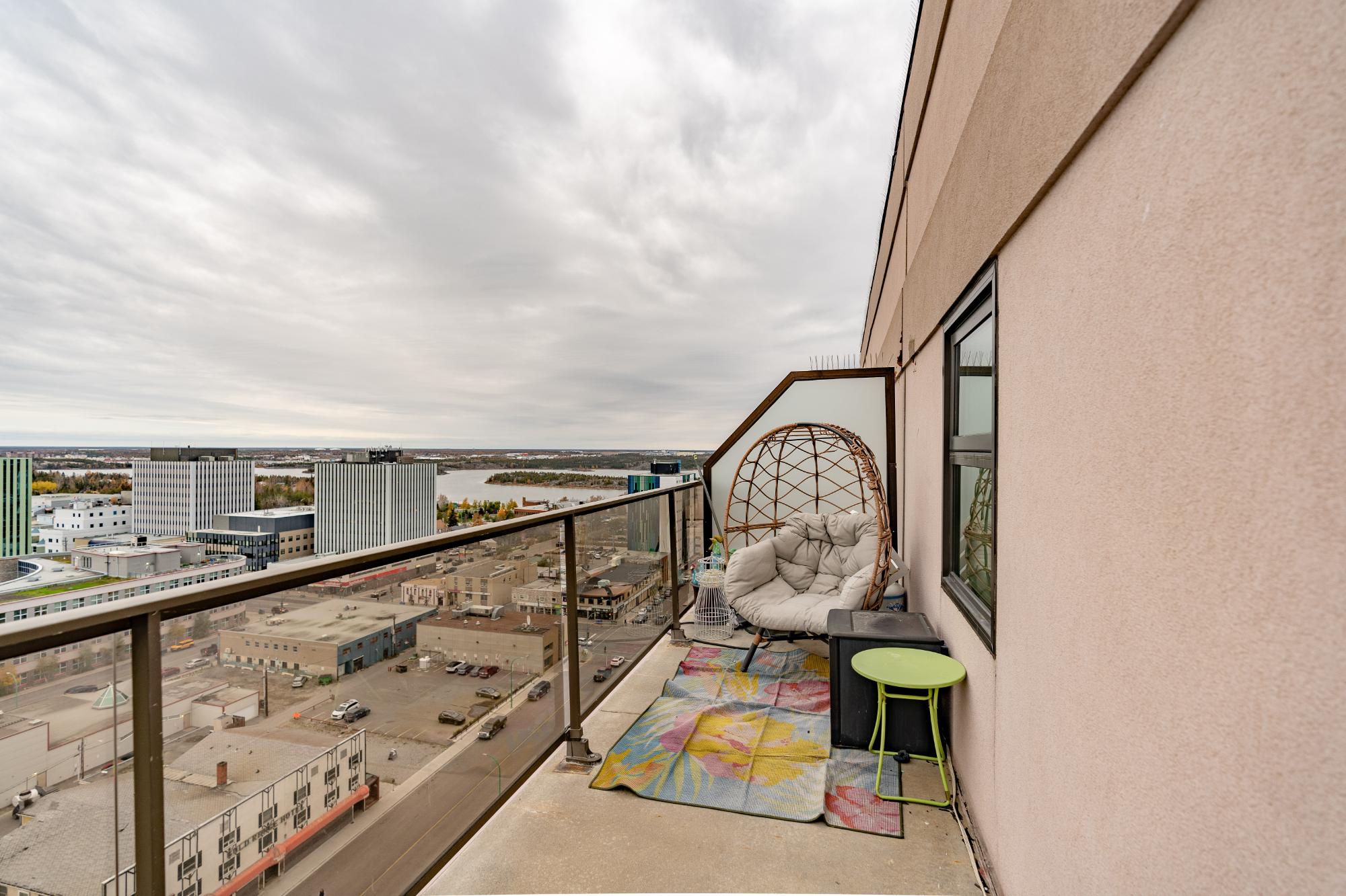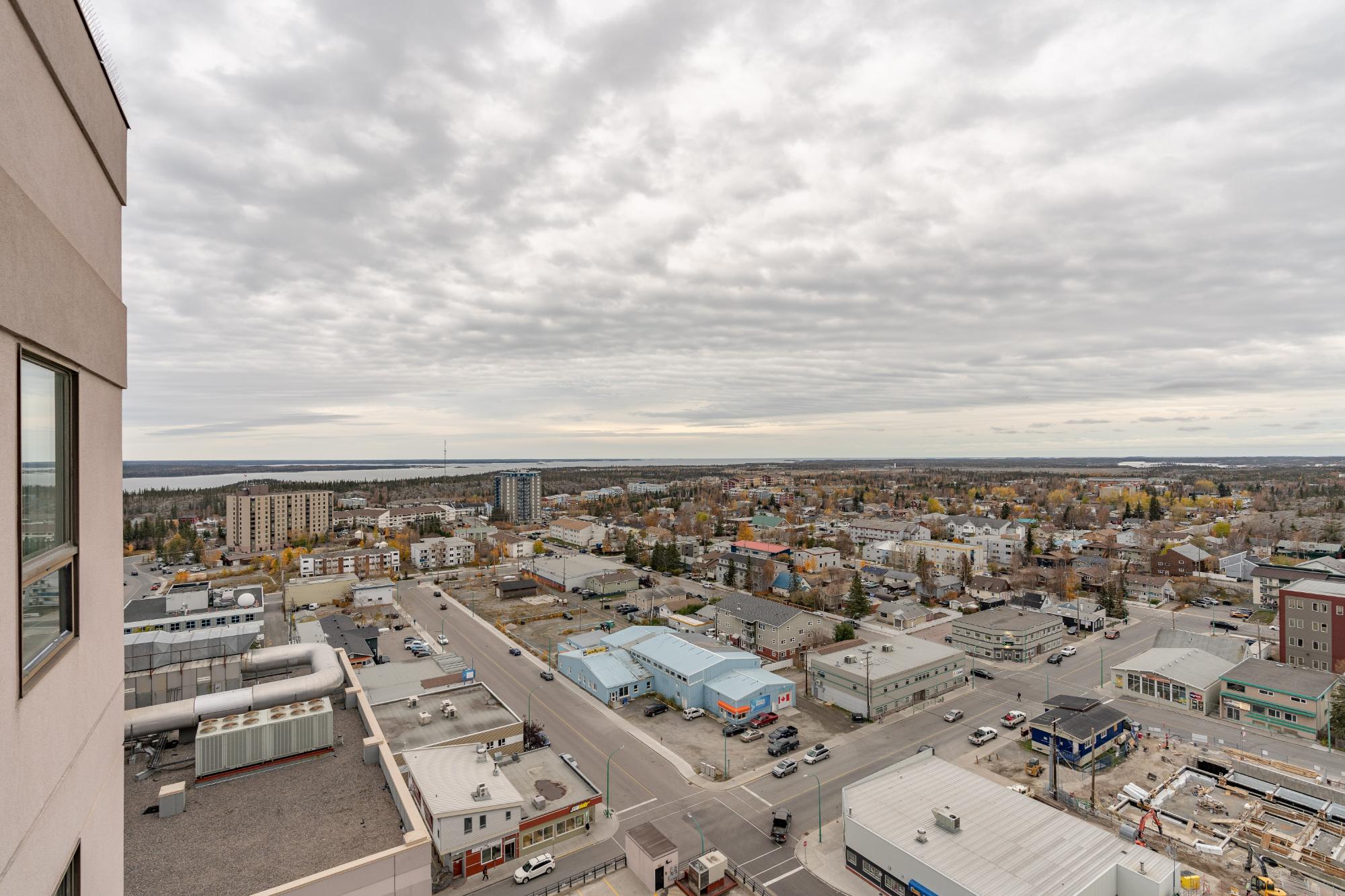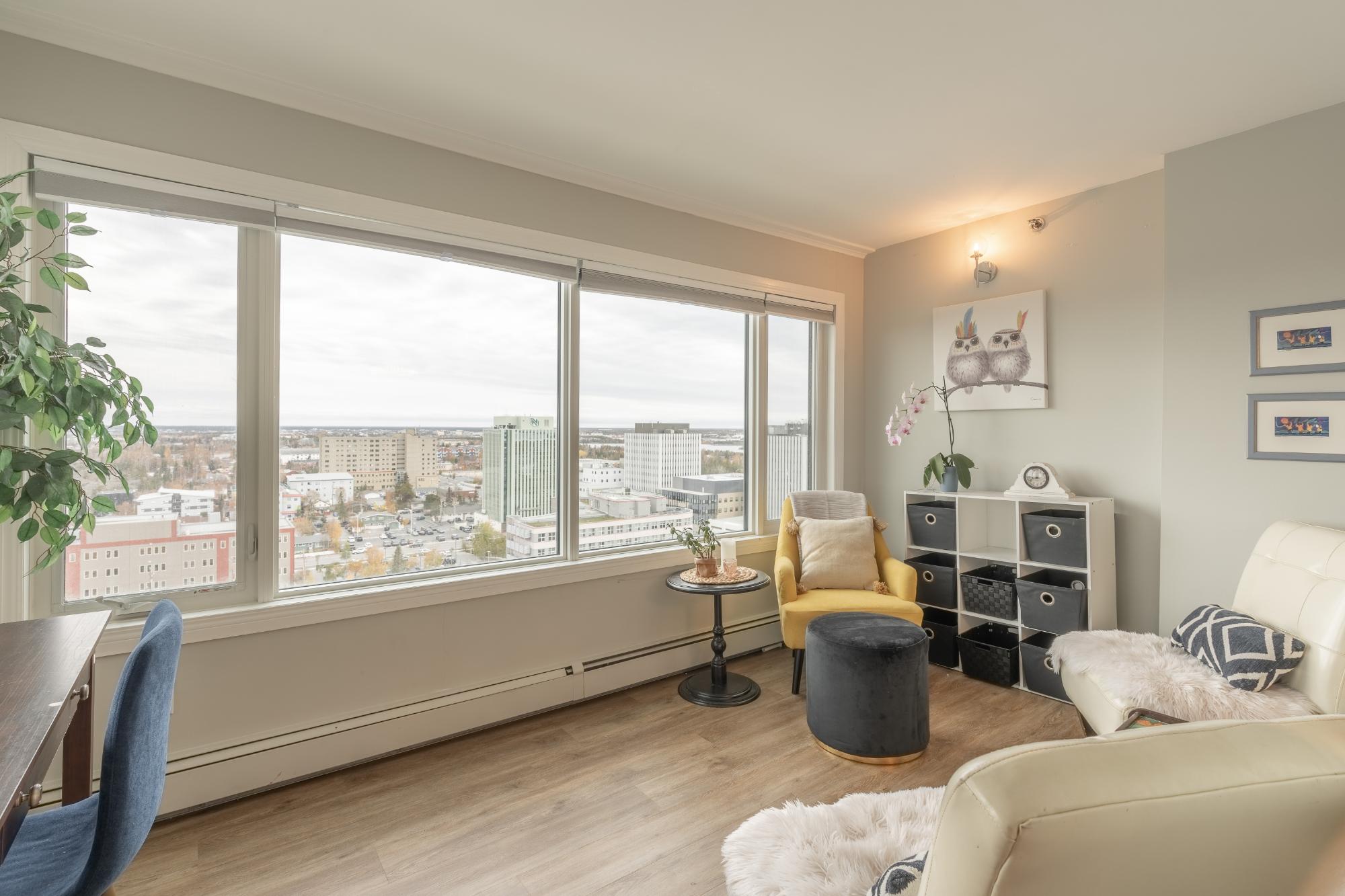 Perched on the 17th floor of Northern Heights in Yellowknife, this executive two-storey penthouse spans over 1,800 sq. ft. with stunning views of the city and Great Slave Lake. It features 2 bedrooms, 3 updated baths, and a bright open living area with a wood-burning fireplace and custom stone wall. The kitchen boasts stainless steel appliances and a custom tile backsplash, while a sunroom with floor-to-ceiling windows fills the space with natural light. Upstairs, the primary suite includes a wall of closets and a renovated ensuite with a soaker tub and walk-in shower. The second bedroom has an updated bath with a jetted tub. Amenities include secure entry, indoor mall access, fitness facilities, racquet courts, party room, and heated underground parking (extra). Condo fees cover heat, water, management, and more. Urban luxury and convenience in the heart of Yellowknife.
