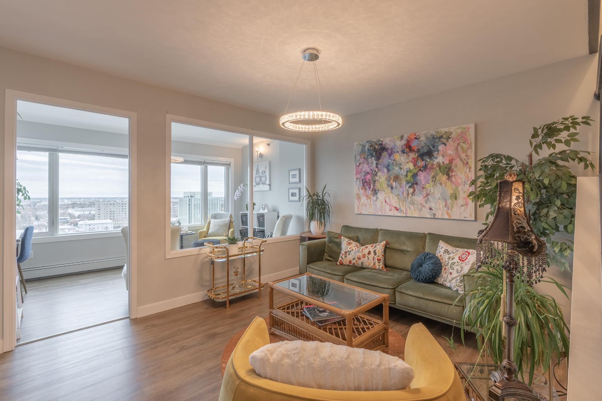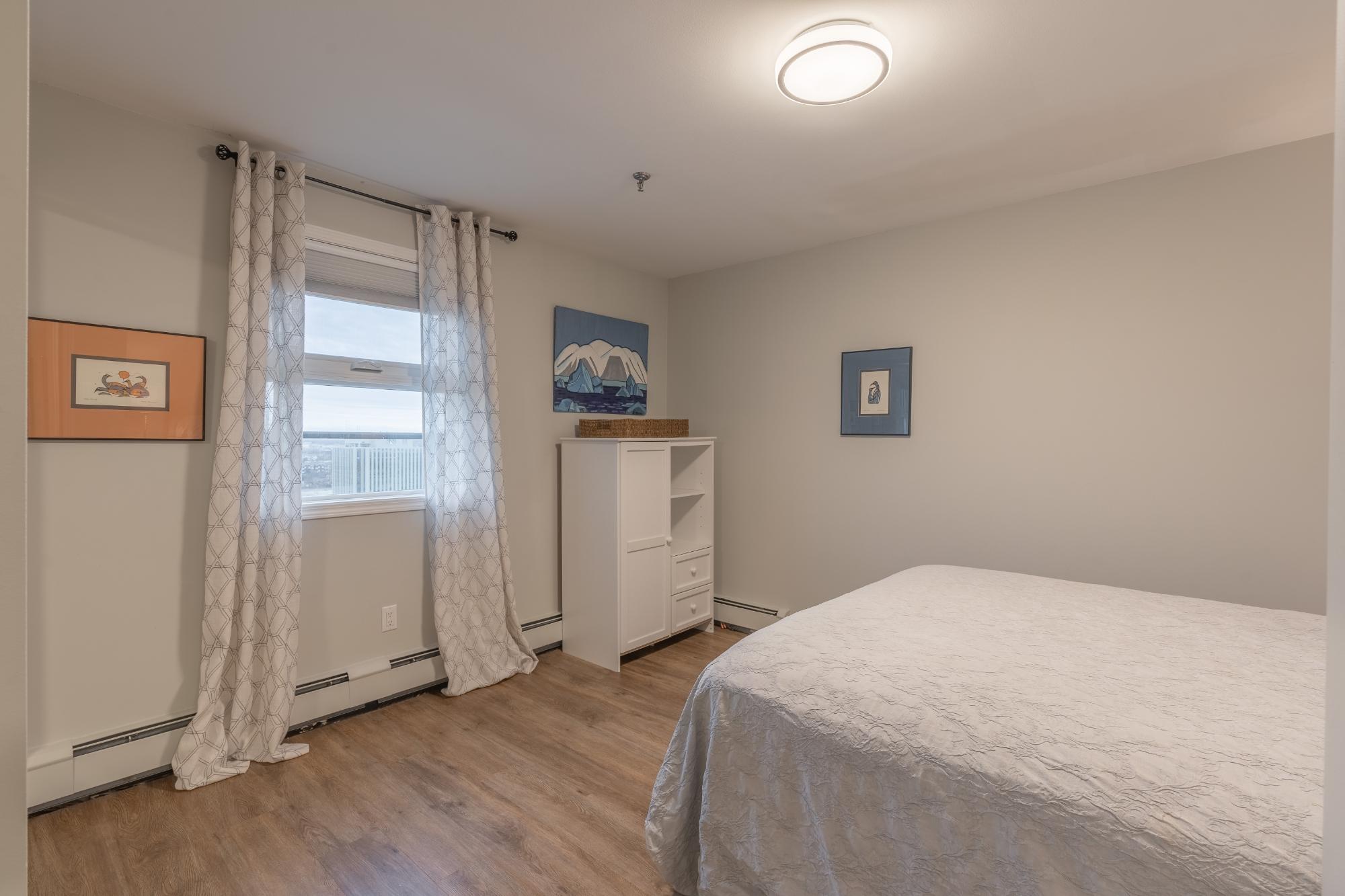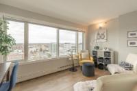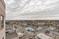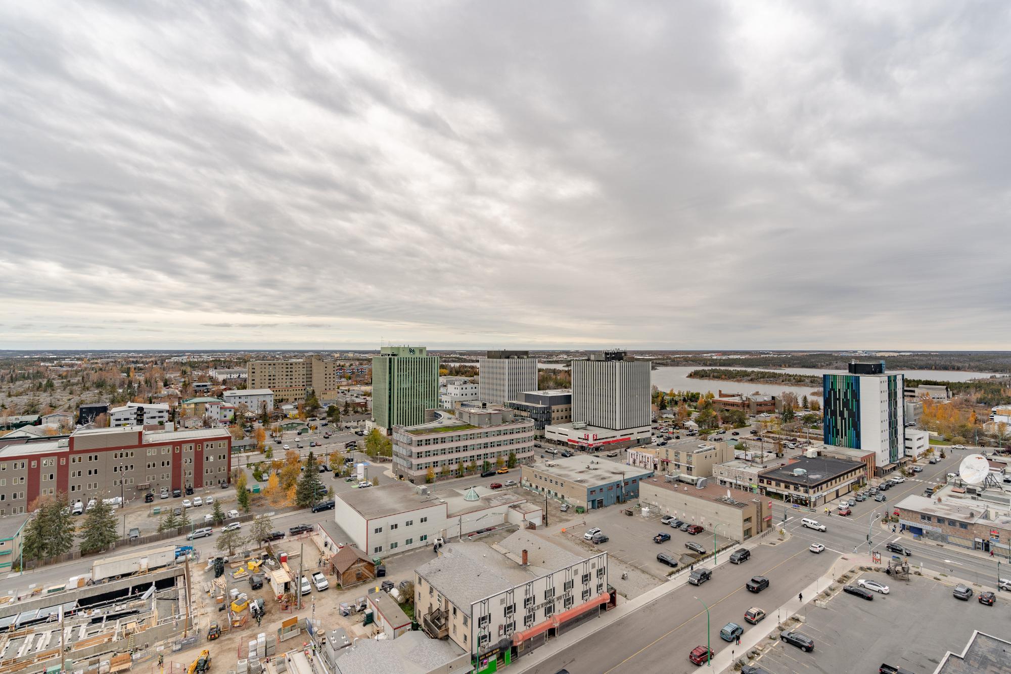 Perched on the 17th floor of Northern Heights in Yellowknife, this executive two-storey penthouse spans over 1,800 sq. ft. with stunning views of the city and Great Slave Lake. It features 2 bedrooms, 3 updated baths, and a bright open living area with a wood-burning fireplace and custom stone wall. The kitchen boasts stainless steel appliances and a custom tile backsplash, while a sunroom with floor-to-ceiling windows fills the space with natural light. Upstairs, the primary suite includes a wall of closets and a renovated ensuite with a soaker tub and walk-in shower. The second bedroom has an updated bath with a jetted tub. Amenities include secure entry, indoor mall access, fitness facilities, racquet courts, party room, and heated underground parking (extra). Condo fees cover heat, water, management, and more. Urban luxury and convenience in the heart of Yellowknife.