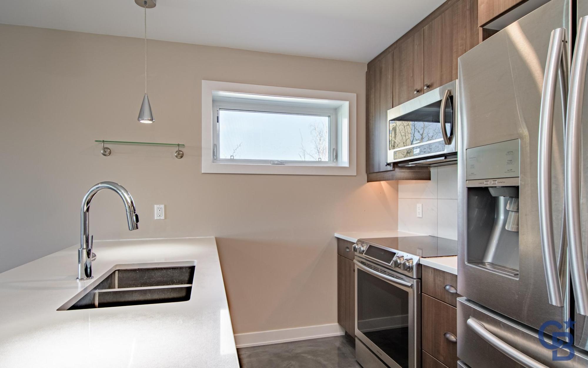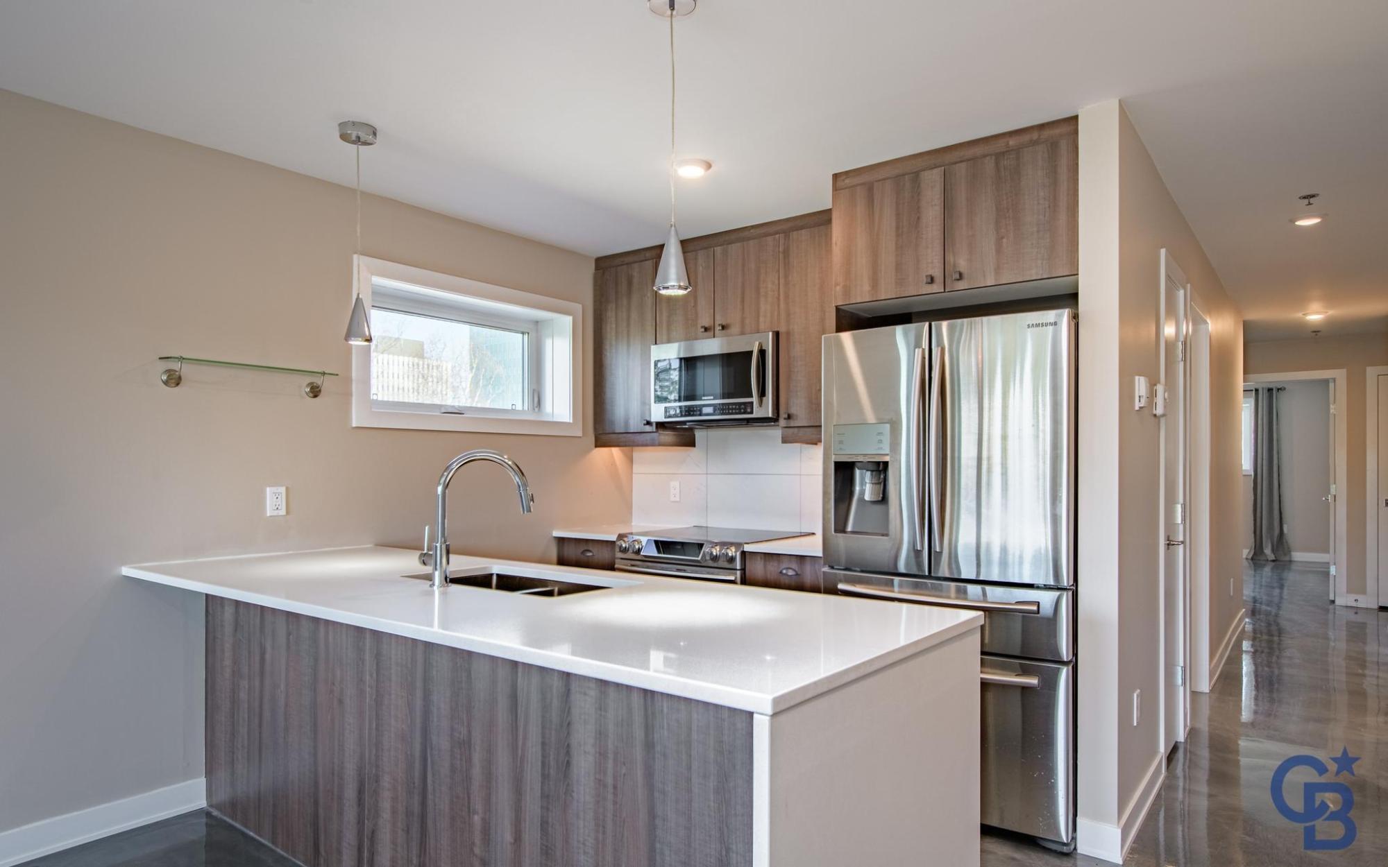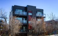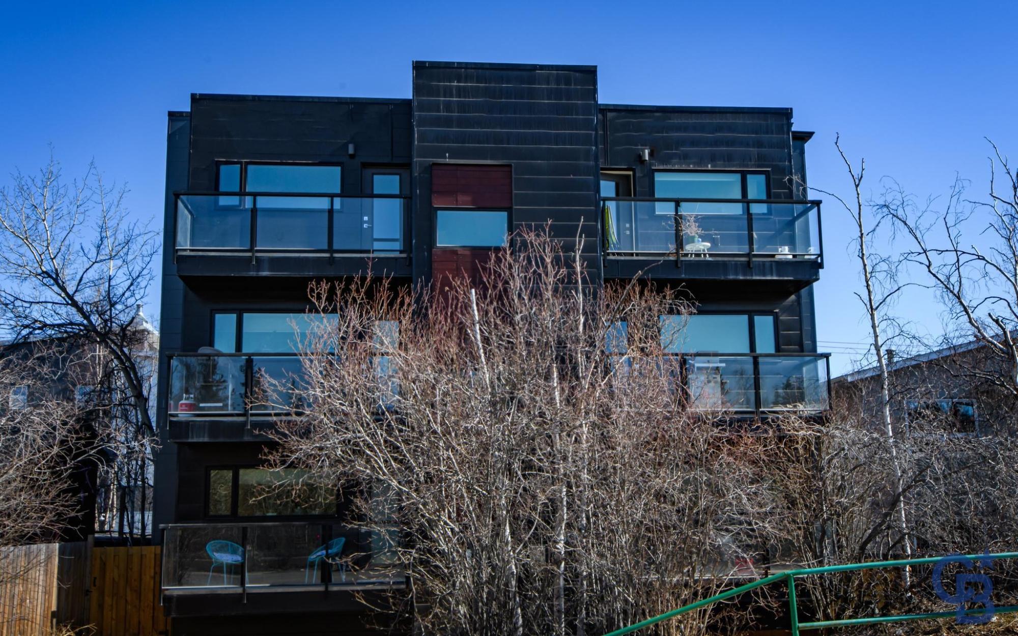 Located in a quiet downtown neighbourhood close to schools, parks and a short walk to restaurants and shopping. This exceptional & modern 2 bedroom, 2 bathroom condo is 1010 sq. ft. with quick possession available. This home features an open concept design allowing for maximum light to flow through to a sunny, south facing deck with glass railings. Sleek Kitchen Kraft cabinets with soft close drawers, white quartz countertops and top-tier stainless steel appliances. The unique polished concrete flooring highlights the space with cozy in-floor heat for maximum comfort. Built to the highest energy efficient standards with recessed LED lighting, triple pane Zone D windows, low-flow shower heads, dual-flush toilets, R34 walls and R53 roof. Noise transmission is reduced with a 2" concrete topper on floor, solid core interior doors and Roxul mineral wool insulation. Warm storage is included in the basement. Condo fees cover: Heat, water, snow removal at parking area, insurance & more.