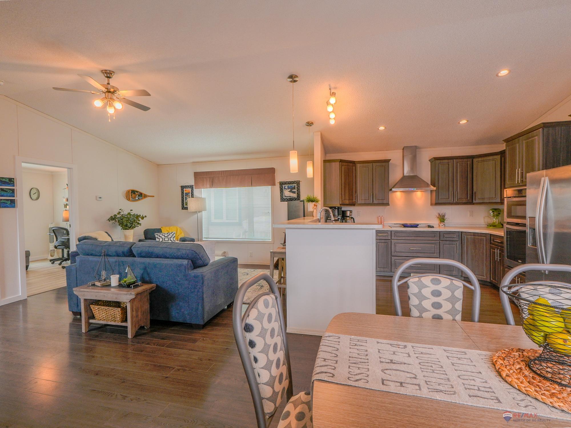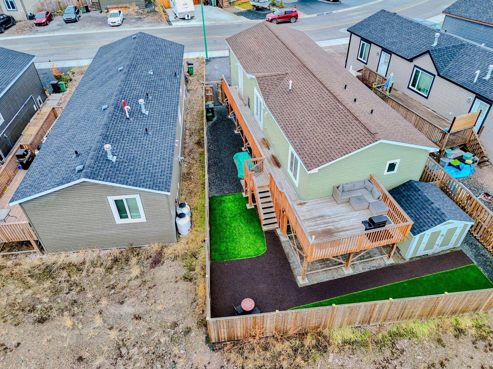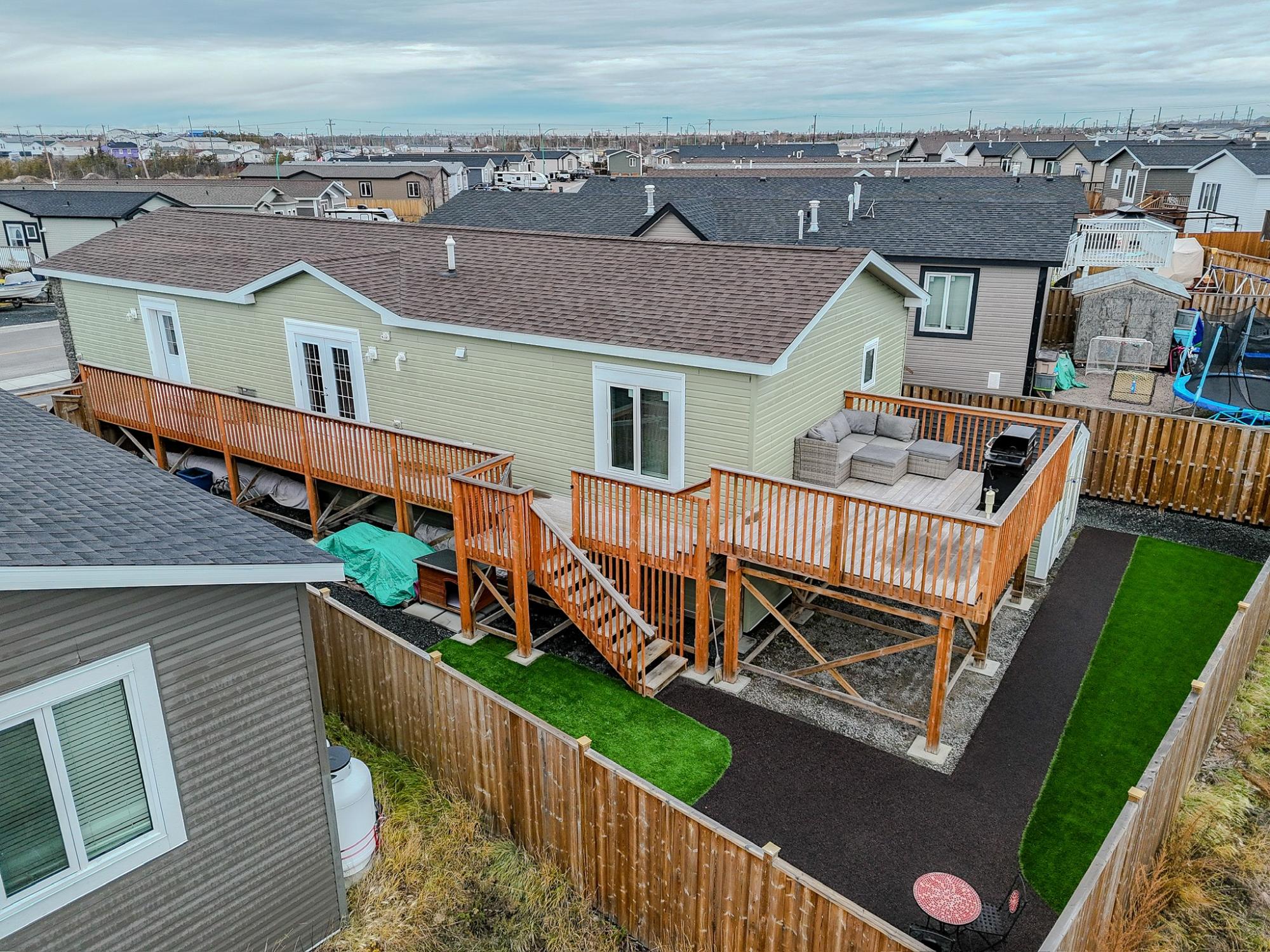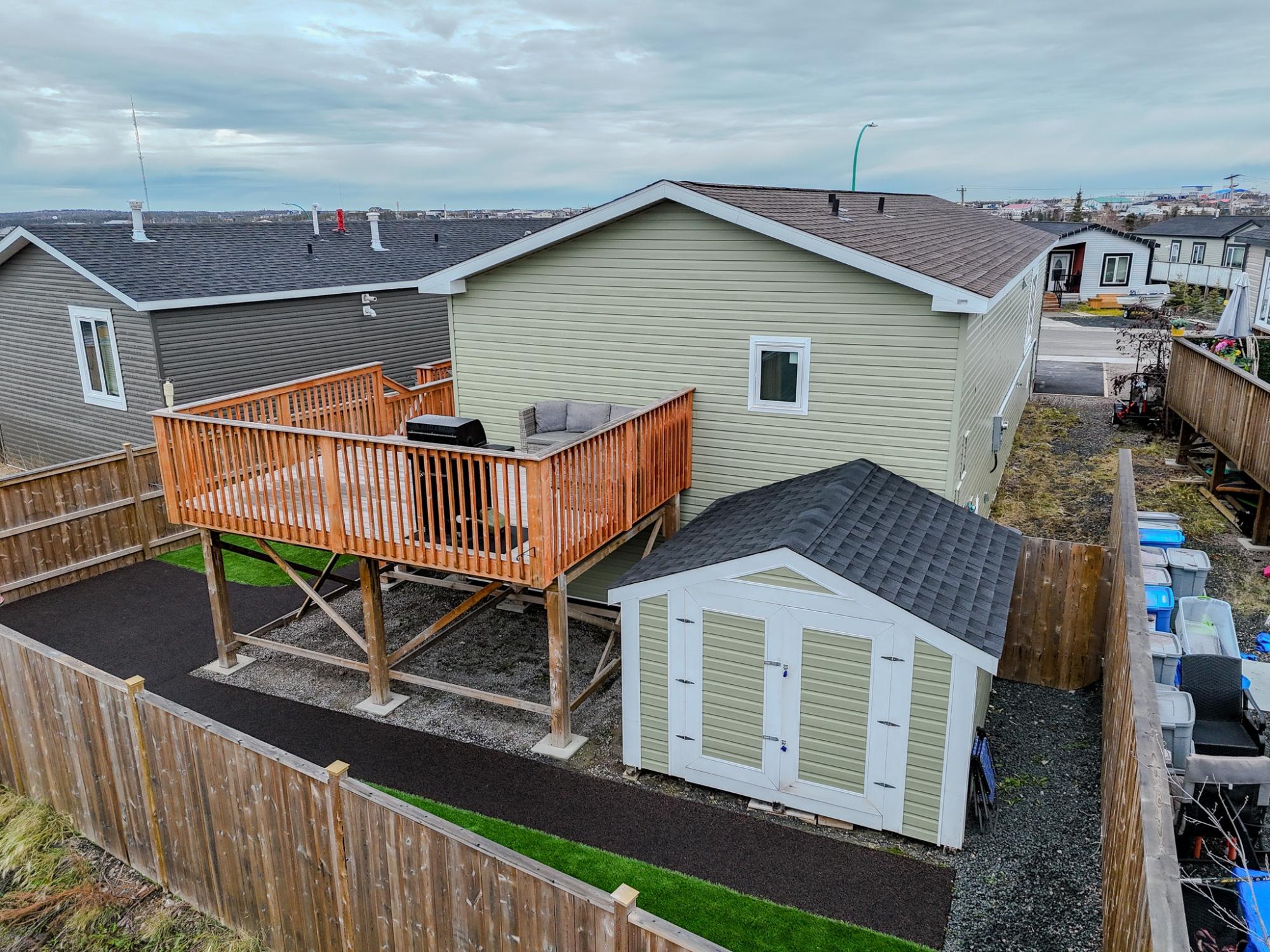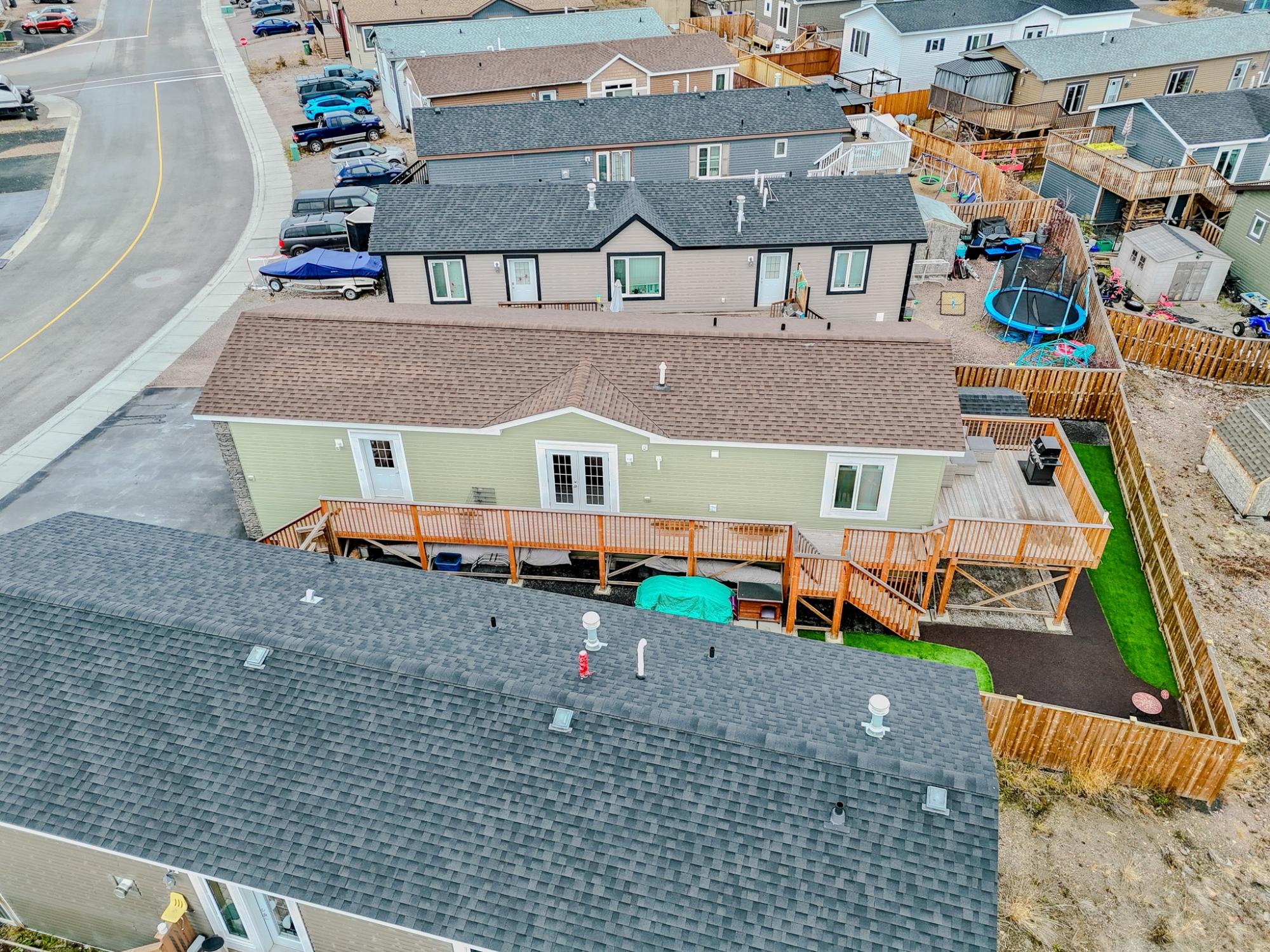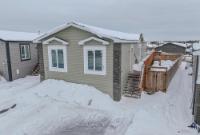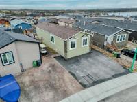 Well-laid-out 3-bedroom, 2-bath home with high-grade laminate throughout the main living areas and cathedral ceilings. The home offers three spacious bedrooms, including a primary retreat with walk-in closet and full ensuite featuring a jetted corner soaker tub/shower and separate linen storage. Bright throughout with large triple-pane windows, plus pot lighting in the kitchen and dining area with garden door for easy BBQ access. The U-shaped kitchen features PVC pewter pine cabinetry in a light grey finish, upgraded hardware, soft-close drawers, raised eating bar and pendant lighting. Fully fenced yard professionally landscaped by Arctic Turf with weed barrier, crush stone, artificial turf, recycled rubber path and sitting area, plus a custom wired shed. Parking for 4 vehicles. Heat 2,286 L propane @.89 $2,035