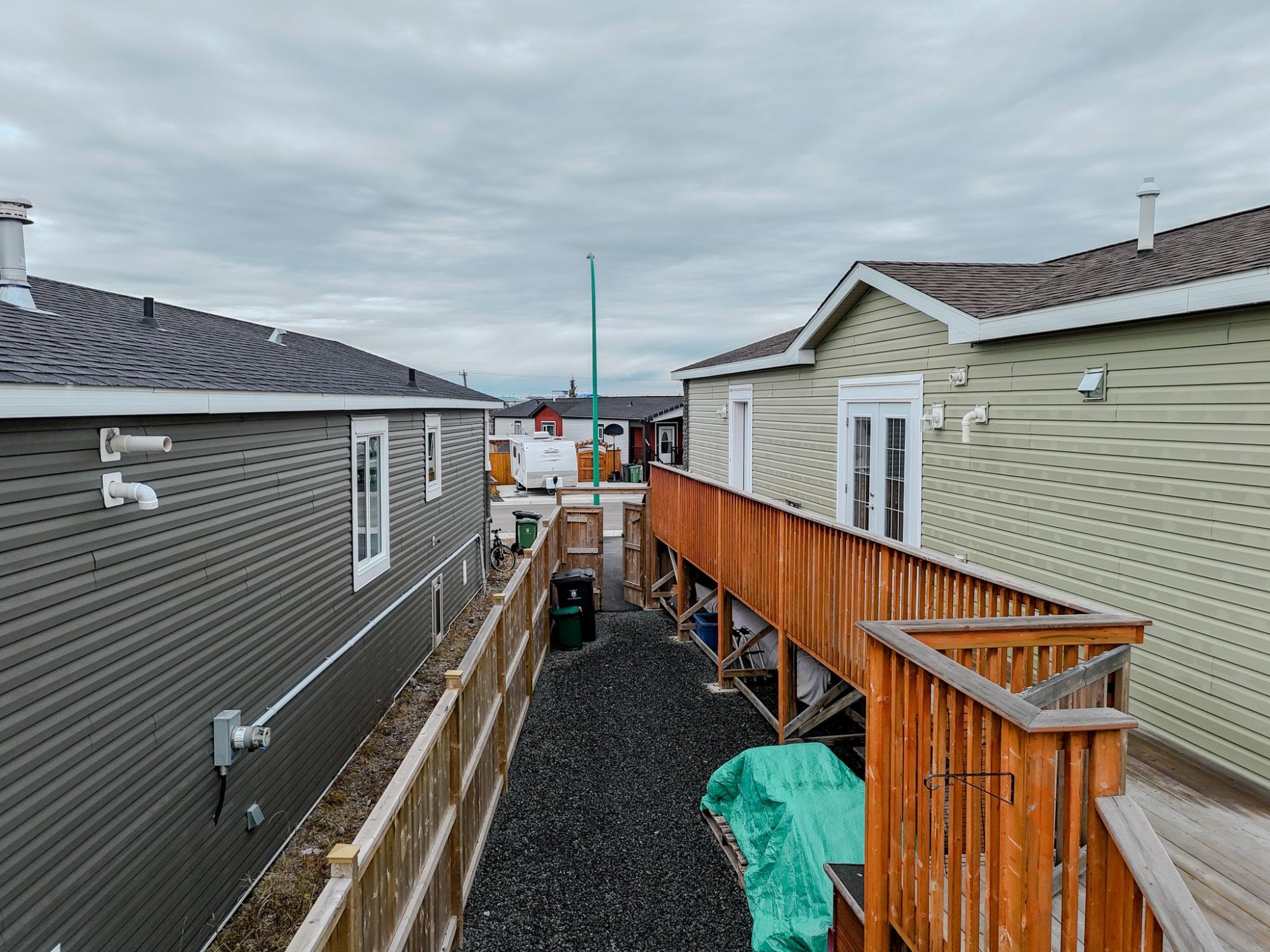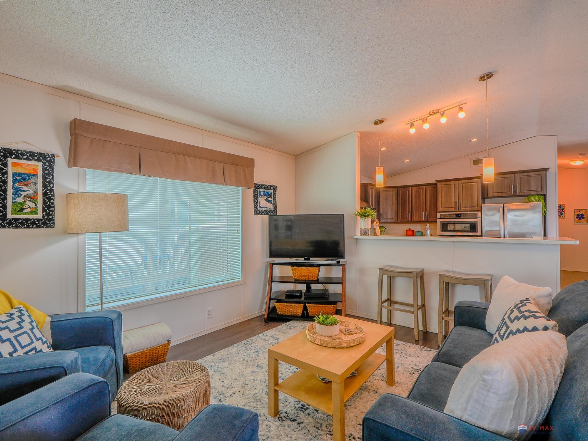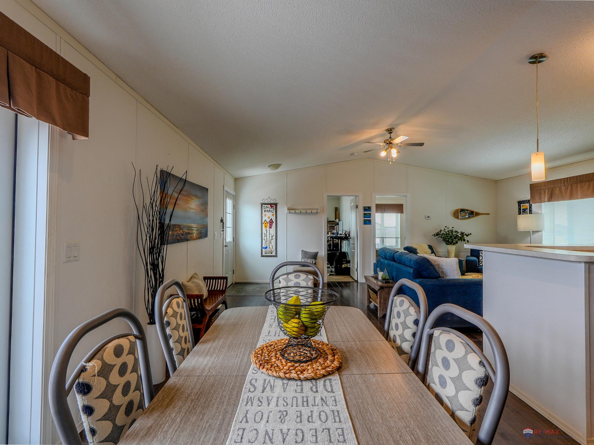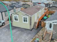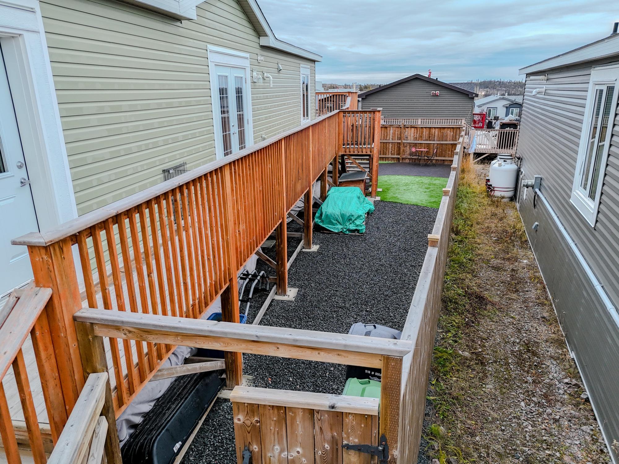 Well-laid-out 3-bedroom, 2-bath home with high-grade laminate throughout the main living areas and cathedral ceilings. The home offers three spacious bedrooms, including a primary retreat with walk-in closet and full ensuite featuring a jetted corner soaker tub/shower and separate linen storage. Bright throughout with large triple-pane windows, plus pot lighting in the kitchen and dining area with garden door for easy BBQ access. The U-shaped kitchen features PVC pewter pine cabinetry in a light grey finish, upgraded hardware, soft-close drawers, raised eating bar and pendant lighting. Fully fenced yard professionally landscaped by Arctic Turf with weed barrier, crush stone, artificial turf, recycled rubber path and sitting area, plus a custom wired shed. Parking for 4 vehicles. Heat 2,286 L propane @.89 $2,035