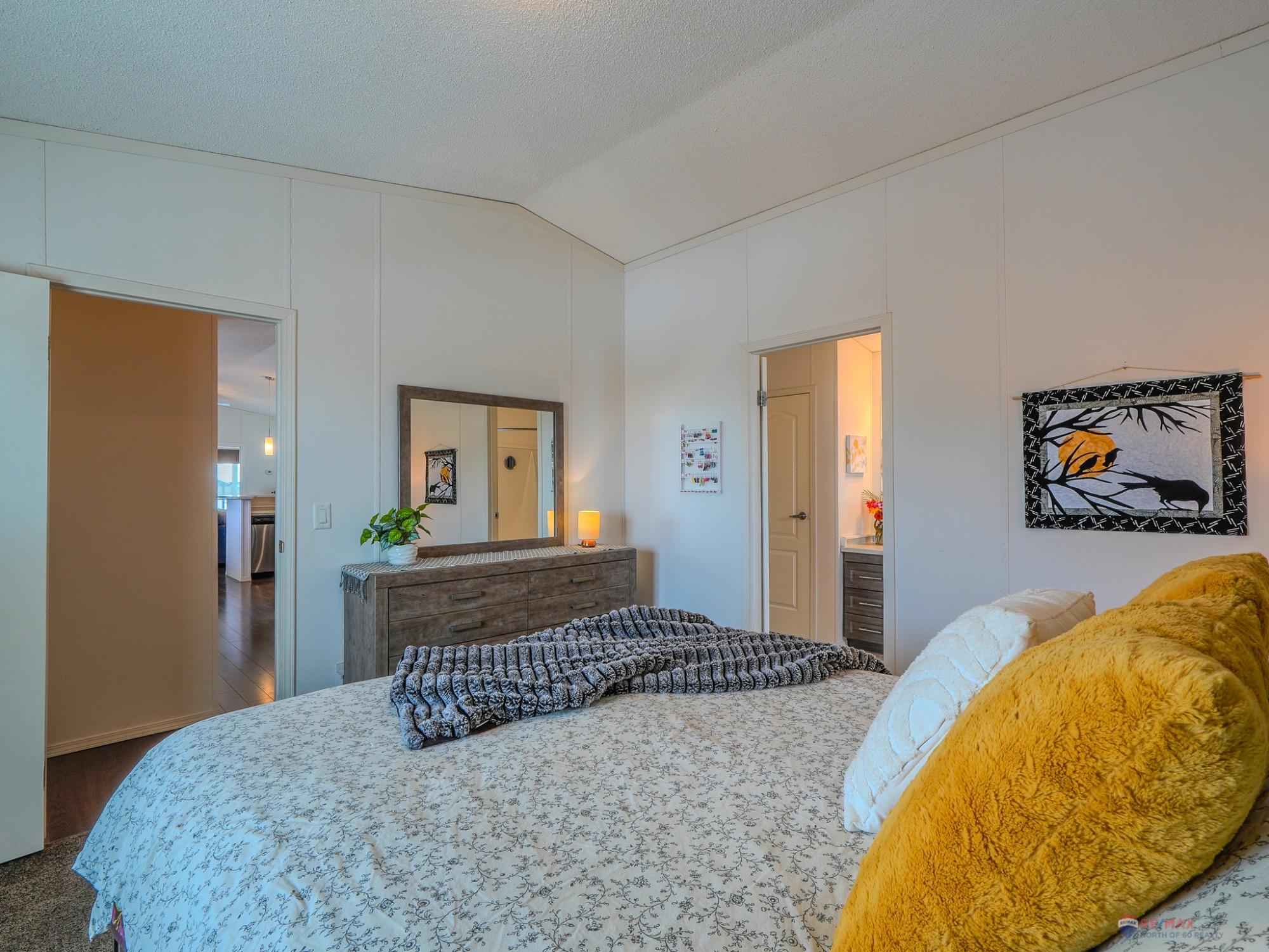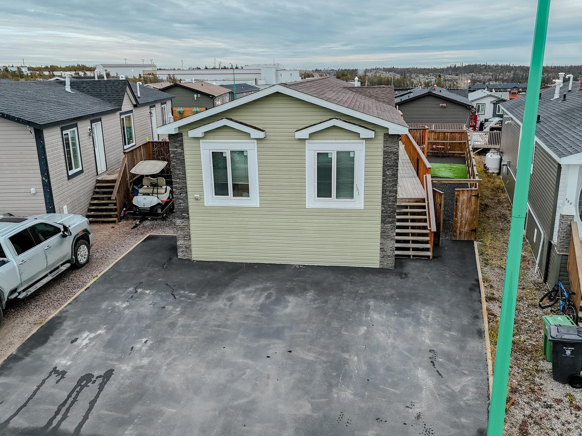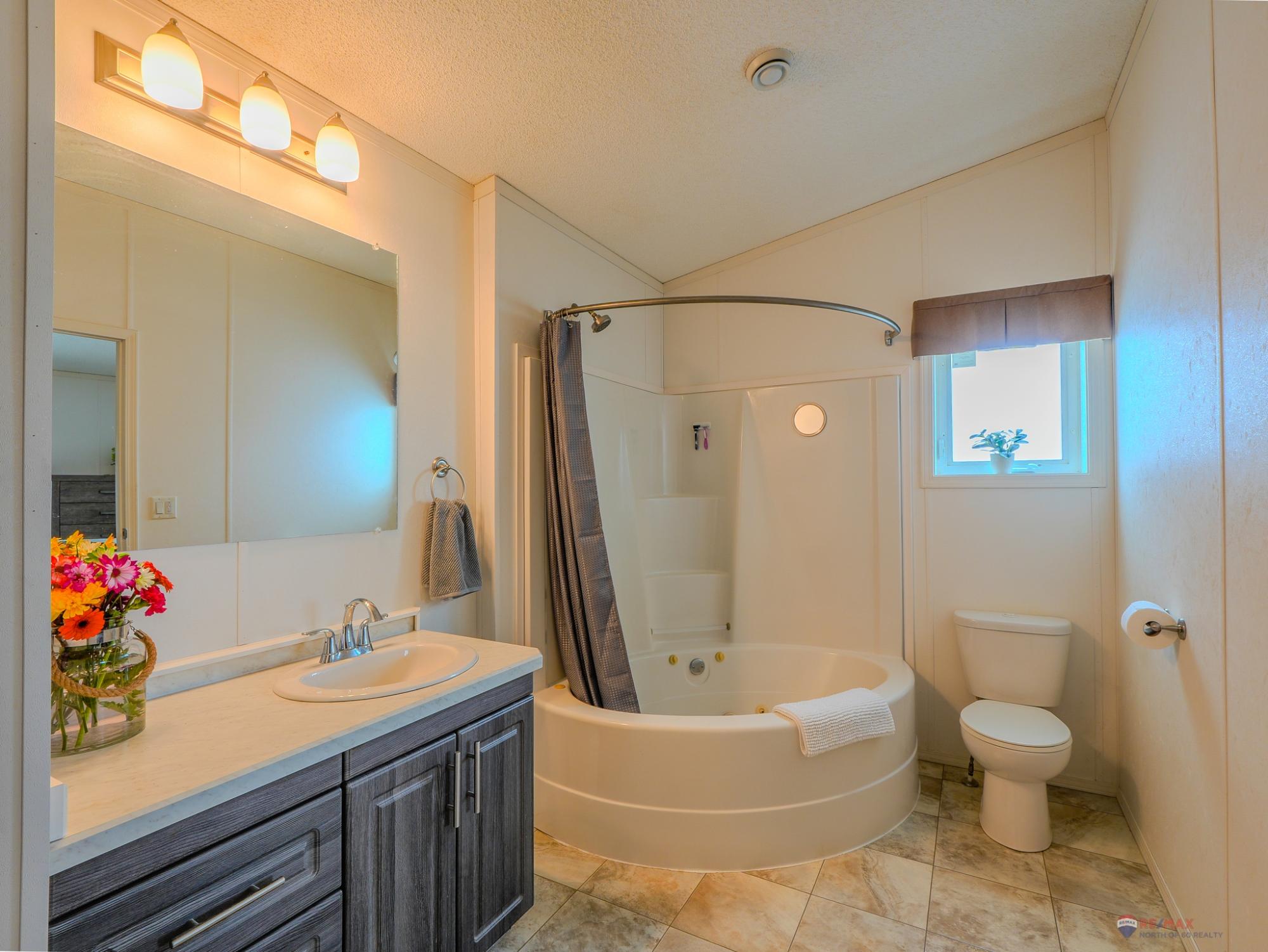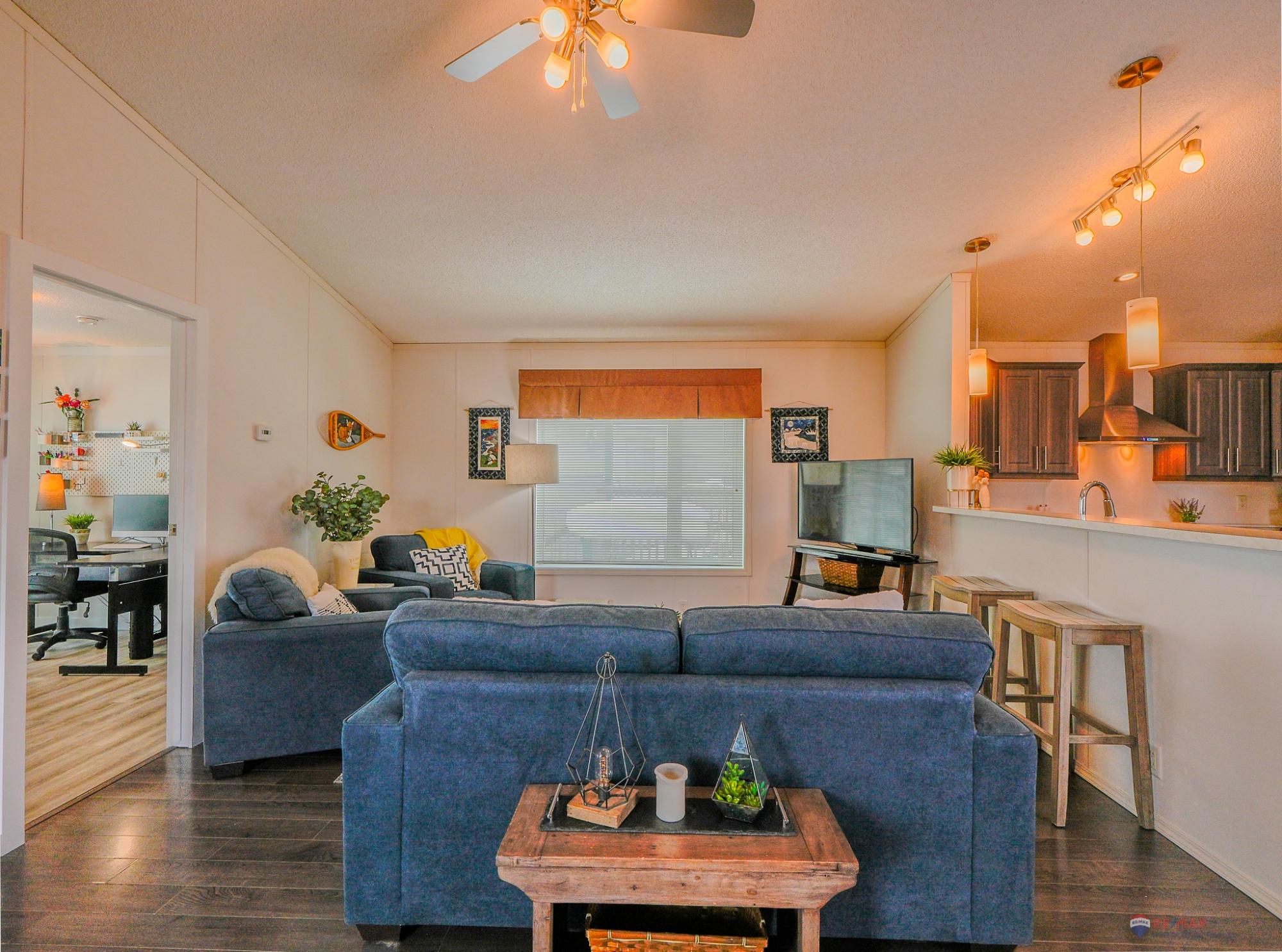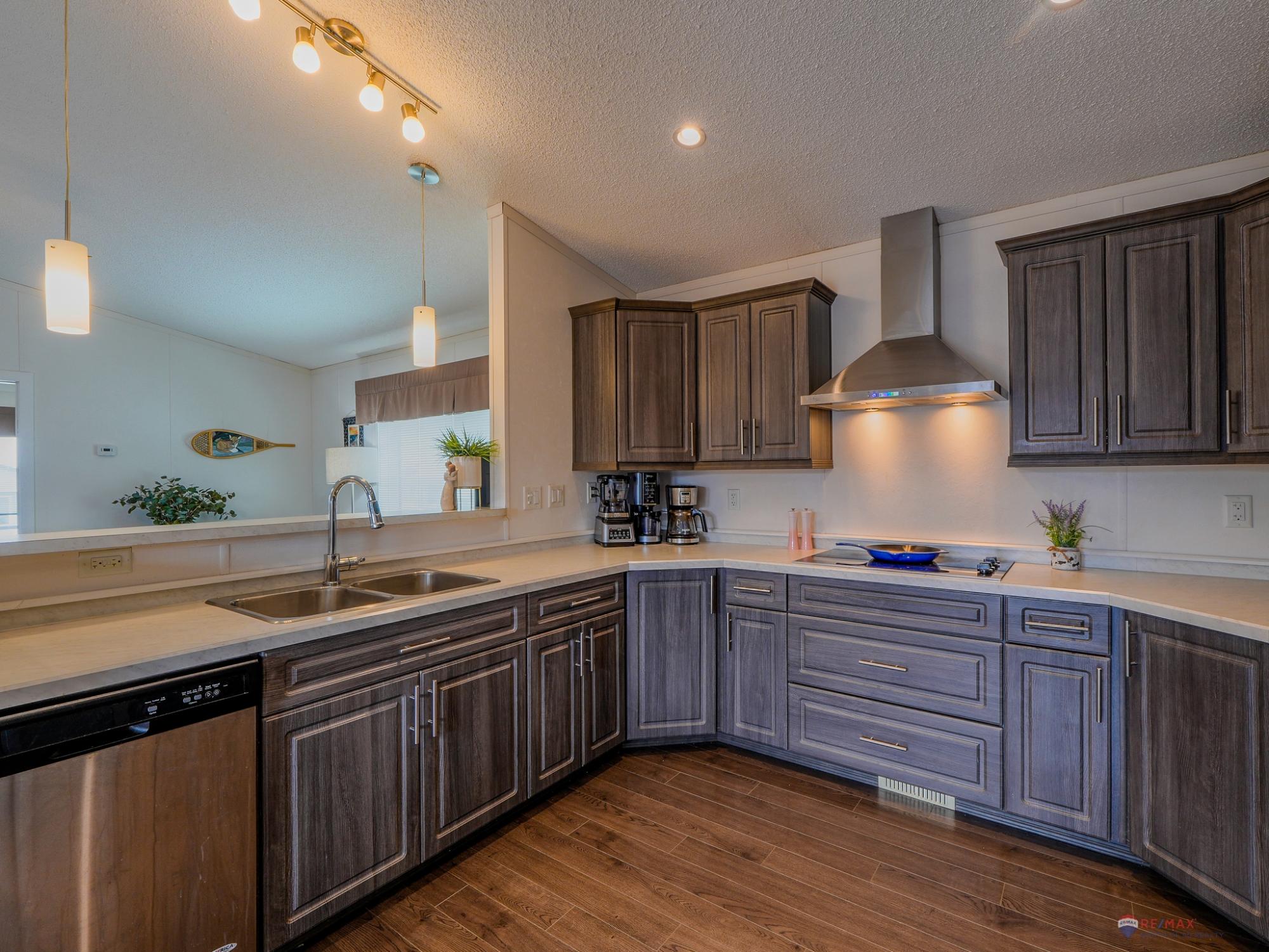 Well-laid-out 3-bedroom, 2-bath home with high-grade laminate throughout the main living areas and cathedral ceilings. The home offers three spacious bedrooms, including a primary retreat with walk-in closet and full ensuite featuring a jetted corner soaker tub/shower and separate linen storage. Bright throughout with large triple-pane windows, plus pot lighting in the kitchen and dining area with garden door for easy BBQ access. The U-shaped kitchen features PVC pewter pine cabinetry in a light grey finish, upgraded hardware, soft-close drawers, raised eating bar and pendant lighting. Fully fenced yard professionally landscaped by Arctic Turf with weed barrier, crush stone, artificial turf, recycled rubber path and sitting area, plus a custom wired shed. Parking for 4 vehicles. Heat 2,286 L propane @.89 $2,035