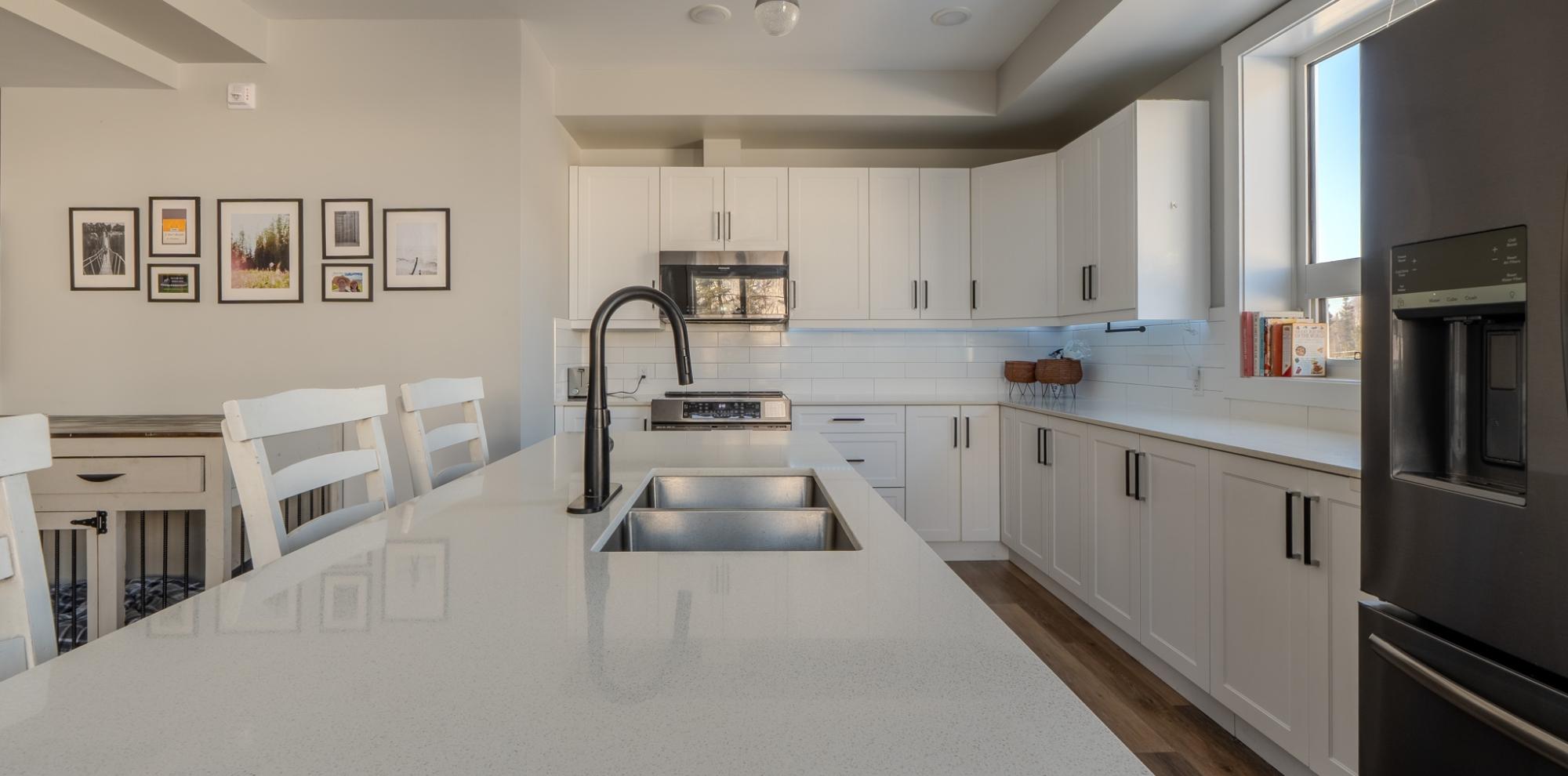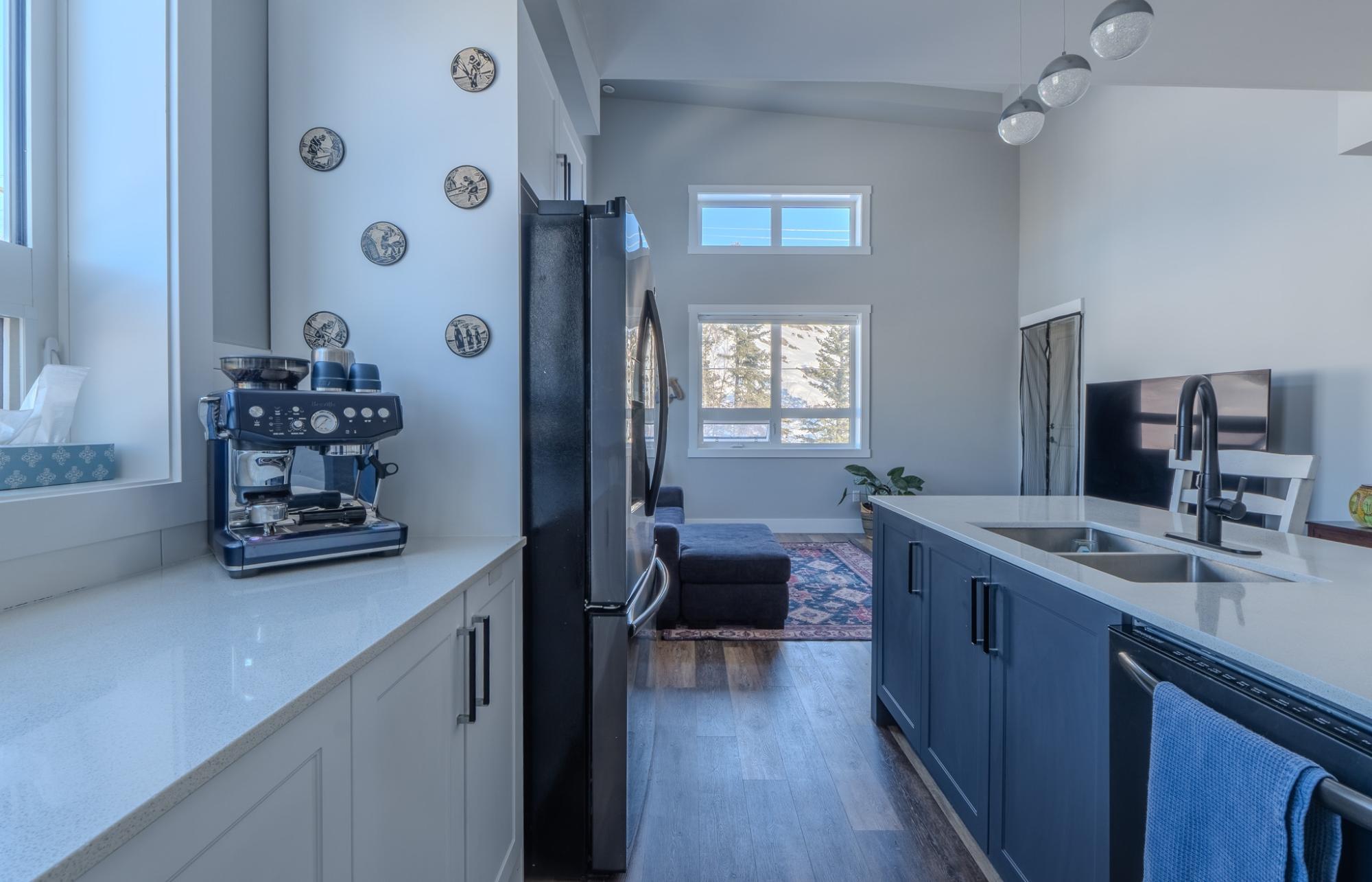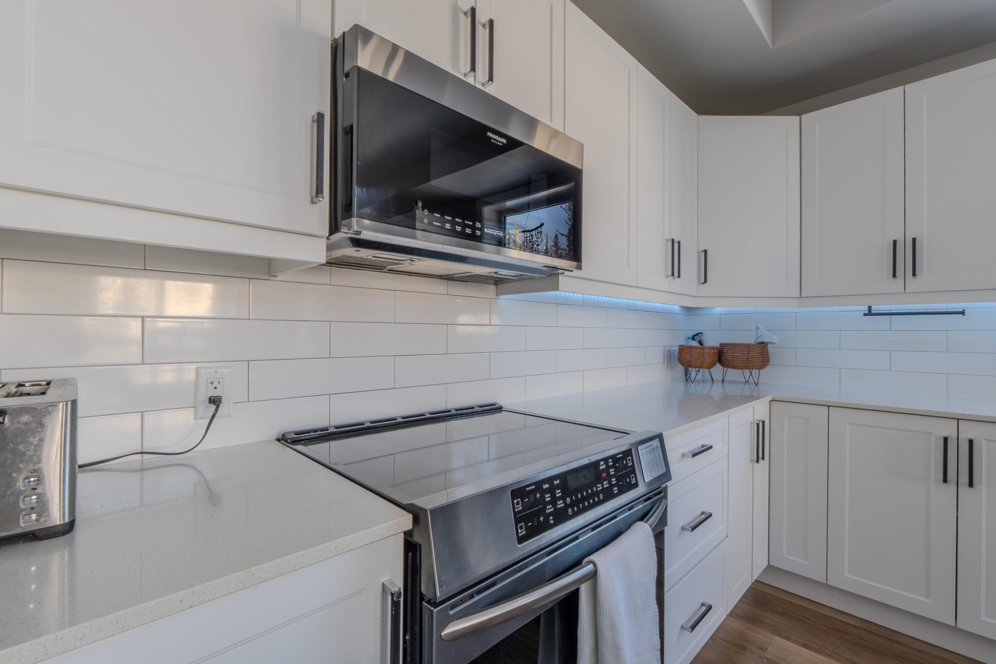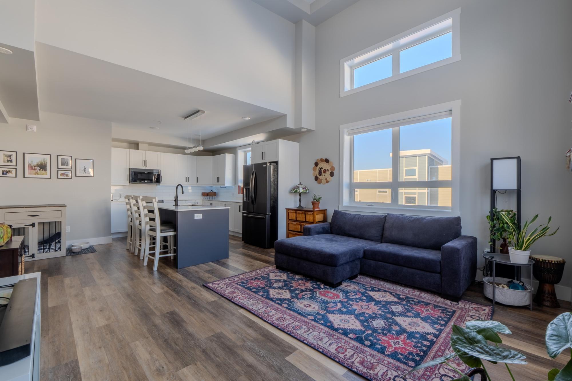 Stunning, like-new 2-bedroom, 2-bathroom West Bay condo just a 10-minute walk to the downtown core. Backing onto Tin Can Hill, this pet-friendly building offers direct access to scenic walking trails perfect for you and your dog. Enjoy beautiful nature views through oversized windows, while 16-ft vaulted ceilings in the living room bring in abundant natural light. The open-concept layout is bright and inviting. The sleek kitchen features a large island with seating, quartz countertops, black stainless steel appliances including an induction cooktop, and a subway tile backsplash. The spacious primary offers a luxurious ensuite with double sinks and tiled shower, while the second bedroom has direct access to the main bath. Additional features include luxury vinyl plank flooring, a large laundry room with storage, ample closets, and a separate mechanical room with NTI propane boiler and on-demand hot water.